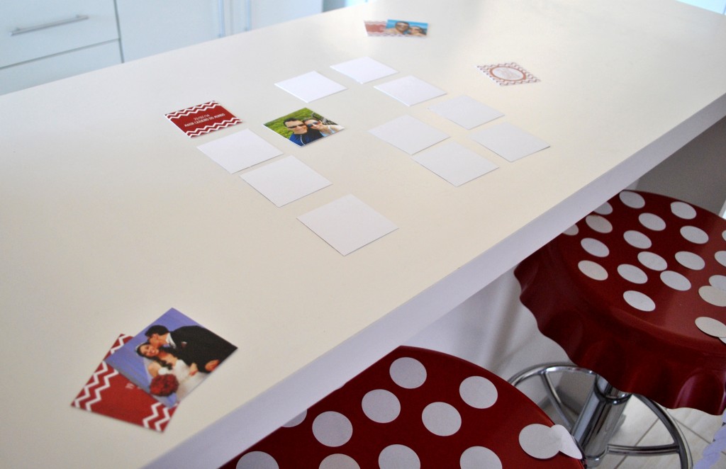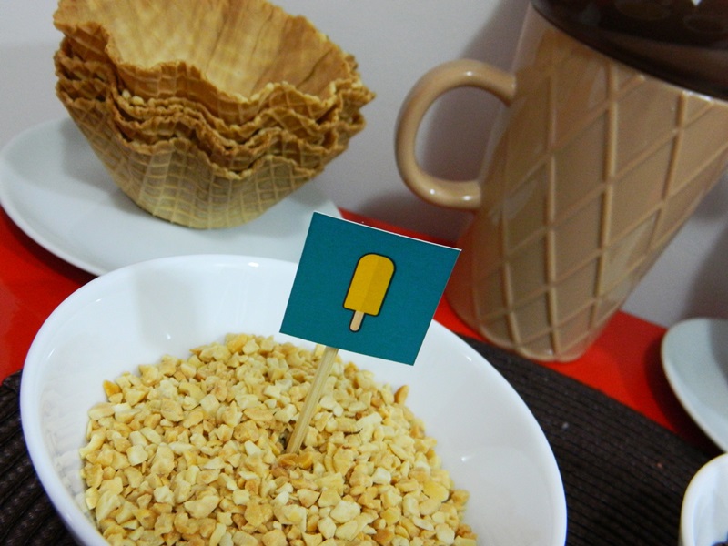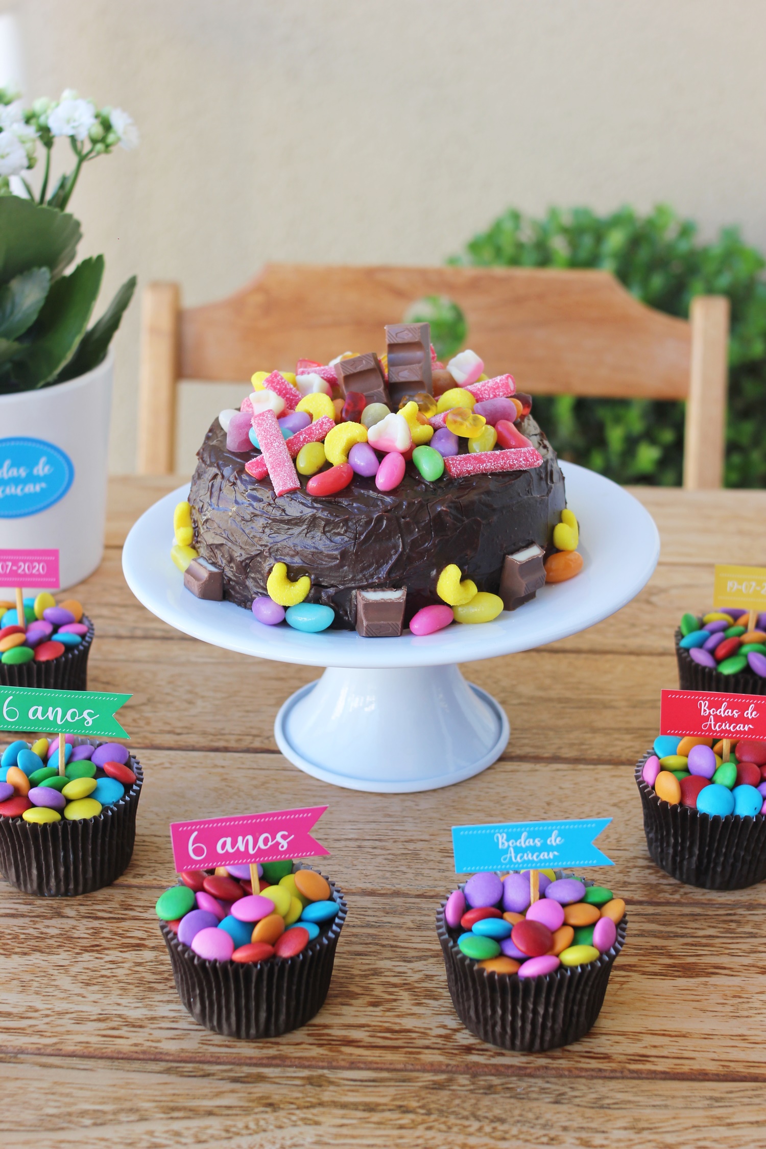 Então começamos a fazer nossa decoração! Colocamos na mesa o bolo e os cupcakes, e para finalizar acrescentamos as tags.