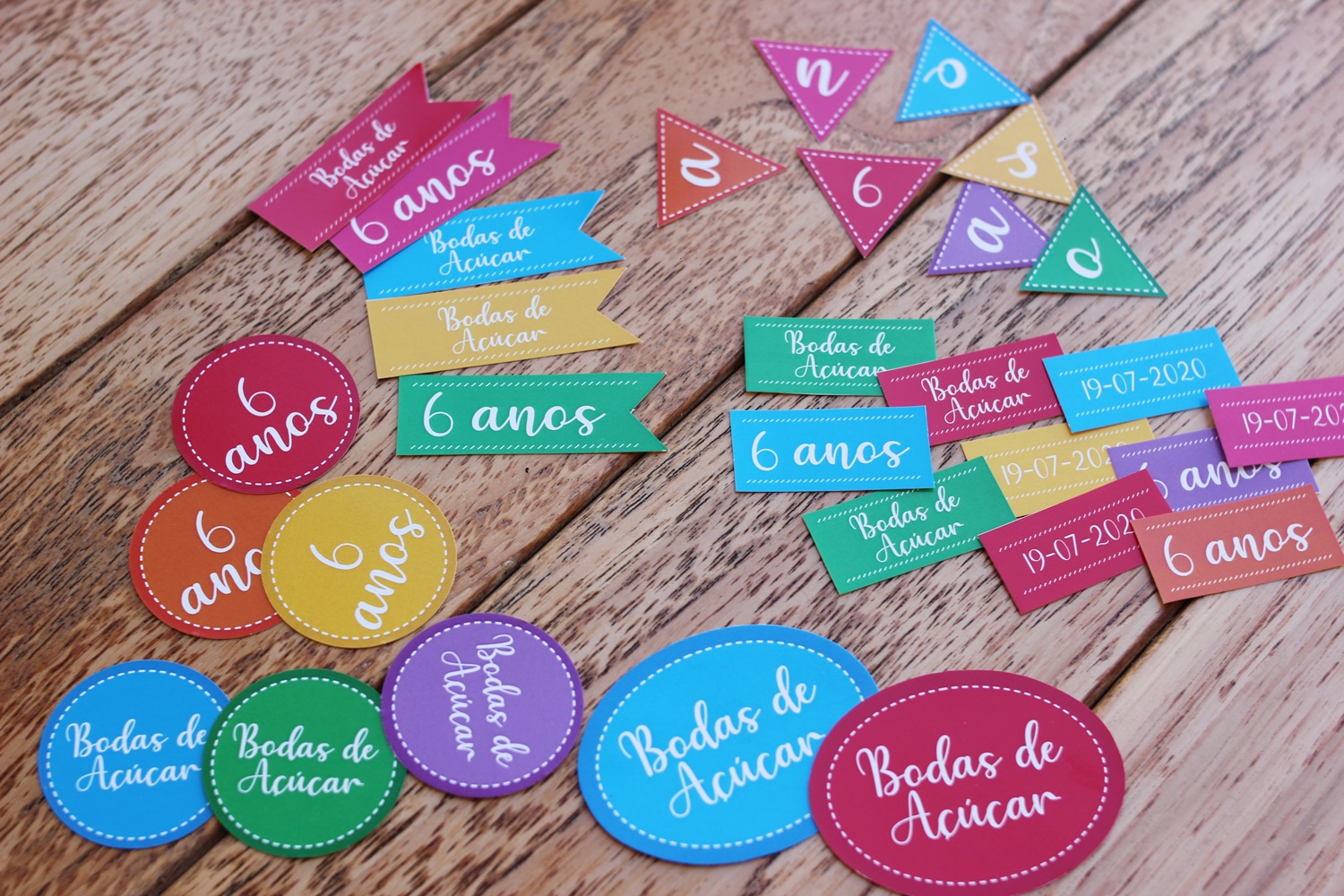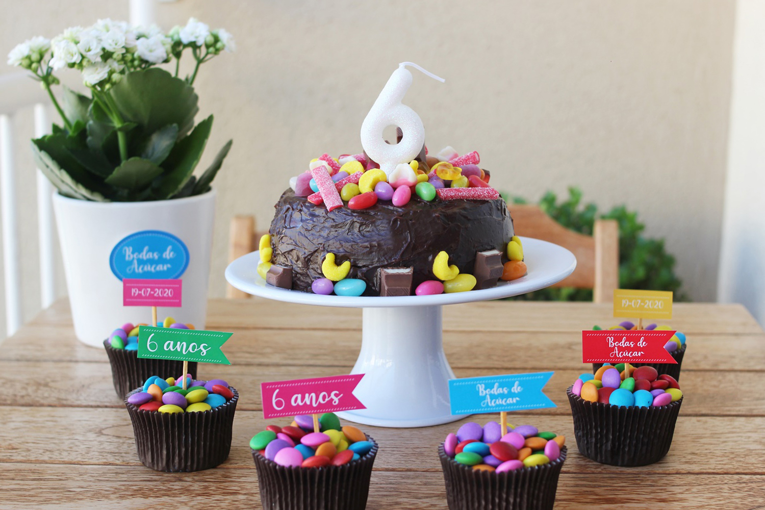 Já que ainda estamos em quarentena, queríamos tornar esse dia especial. Então, compramos muuitos doces lá nas lojas Americanas, encomendamos cupcakes e criei essas tags para decorar a mesa. Pensei nessas cores, porque os cupcakes seriam decorados com confete! (No final do post tem o arquivo para download).