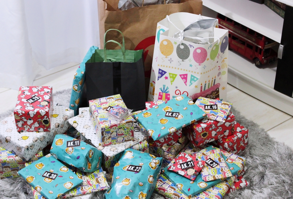 Todos os presentes do Mike tinham uma plaquinha, indicando meu nome mais um número.