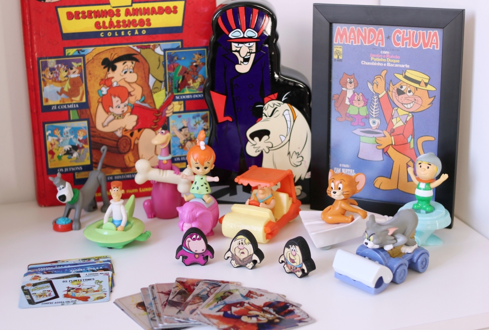 Para quem não sabe eu coleciono várias coisas e uma delas são itens da Hanna Barbera, se ainda não viu, clica aqui para ver o post sobre minha coleção. Pensando nisso, o Mike, encontrou itens raros e mega variados. Teve: cofre, livro ilustrado com os desenhos clássicos o livro é de 1995, O gibi nº 1 do Manda Chuva da Abril de 1975 emoldurado, brindes do Mc Donalds de 2008, cartão telefônico, SIM, cartão telefônico com a propaganda dos Dvd’s da minha coleção, Ovoides dos Flintstones da Omelete Box e cards de alumínio também da Omelete Box <3