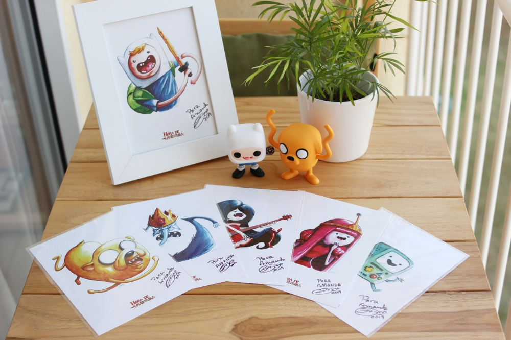 E no dia seguinte ainda teve mais! O Mike me deu esses desenhos maravilhosos e autografados, do ilustrador Diego Augusto clica aqui para conhecer mais. Um desenho mais lindo que o outro, vou revezar o desenho no meu quadrinho, o desenho da semana vai ser o Finn!