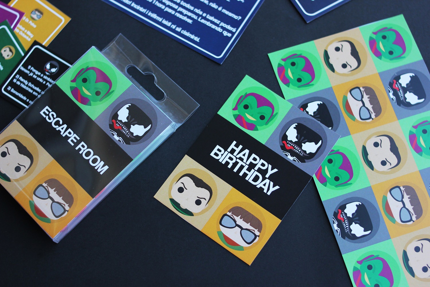 Para a identidade visual fiz: tag com o rostinho dos personagens, bandeirinhas para representar cada elemento, plaquinhas com os nomes das comidinhas, cards já que o Mike é um mega colecionador de cards, e vários outros elementos.