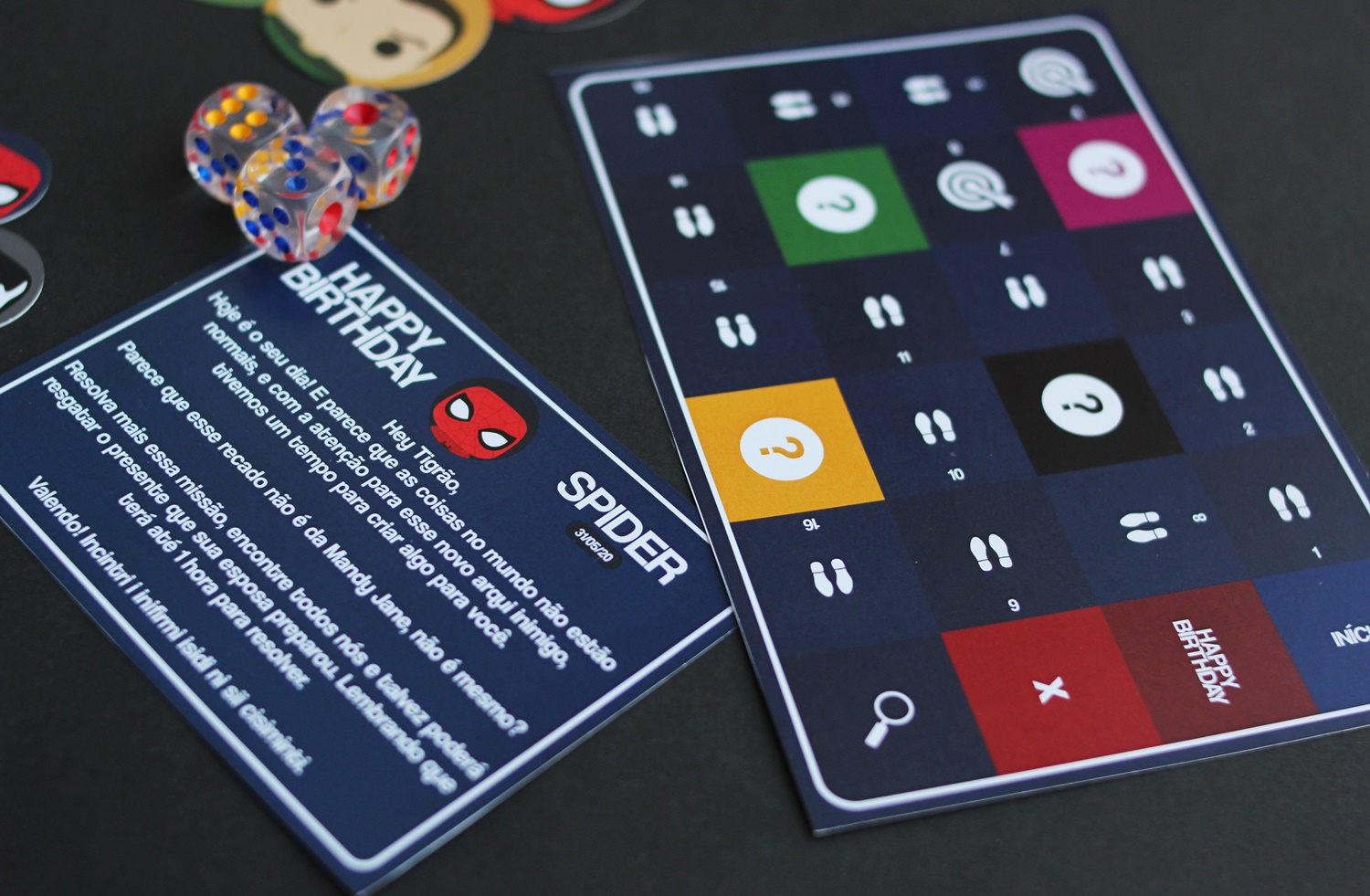 Criamos também um board game baseado em conhecimentos gerais da vida da Amanda, desde o nascimento até os dias atuais. O game seria utilizado para que no decorrer dele os presentes fossem entregues conforme os pontos pré-determinados fossem alcançados, e esses pontos eram conquistados acertando perguntas diretas.