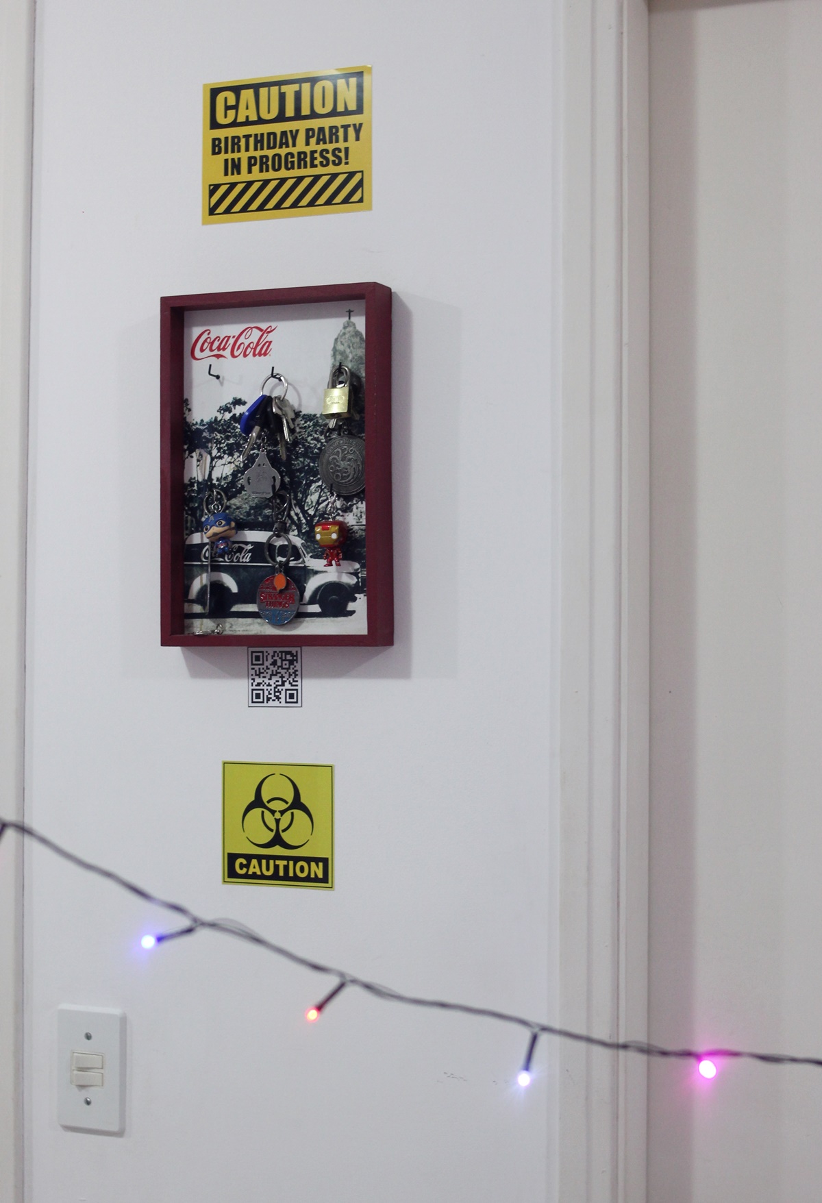 Depois, de toda essa maratona de montagem, meu dia começou aproximadamente 00:00, eu estava dormindo e o Mike veio me chamar. Aguardei um pouquinho enquanto ele finalizava os preparativos no quarto. A casa estava toda escura. Então a caça ao tesouro começou, eu precisava encontrar QR codes espalhados pelo quarto e descobrir qual a mensagem ele escondia.