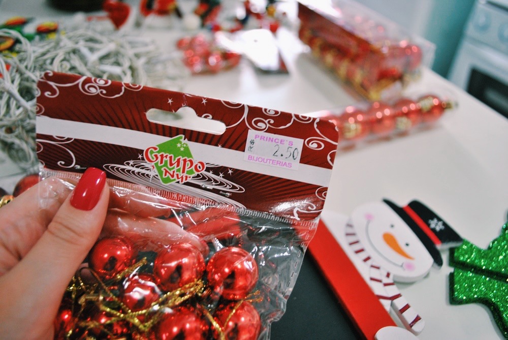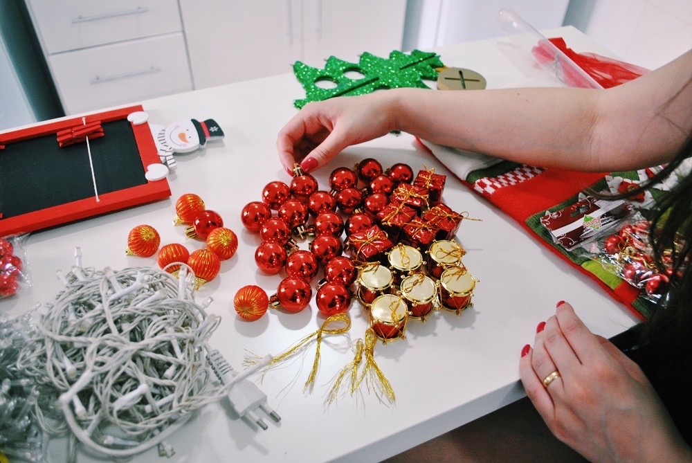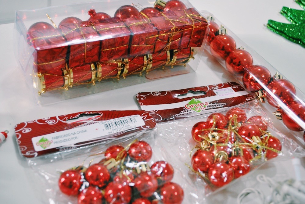 • Embalagem com 24 unidades – 6 bolinha vermelhas, 6 bolinhas vermelhas decoradas (que não usamos), 6 presentes e 6 tambores: R$ 9,00.