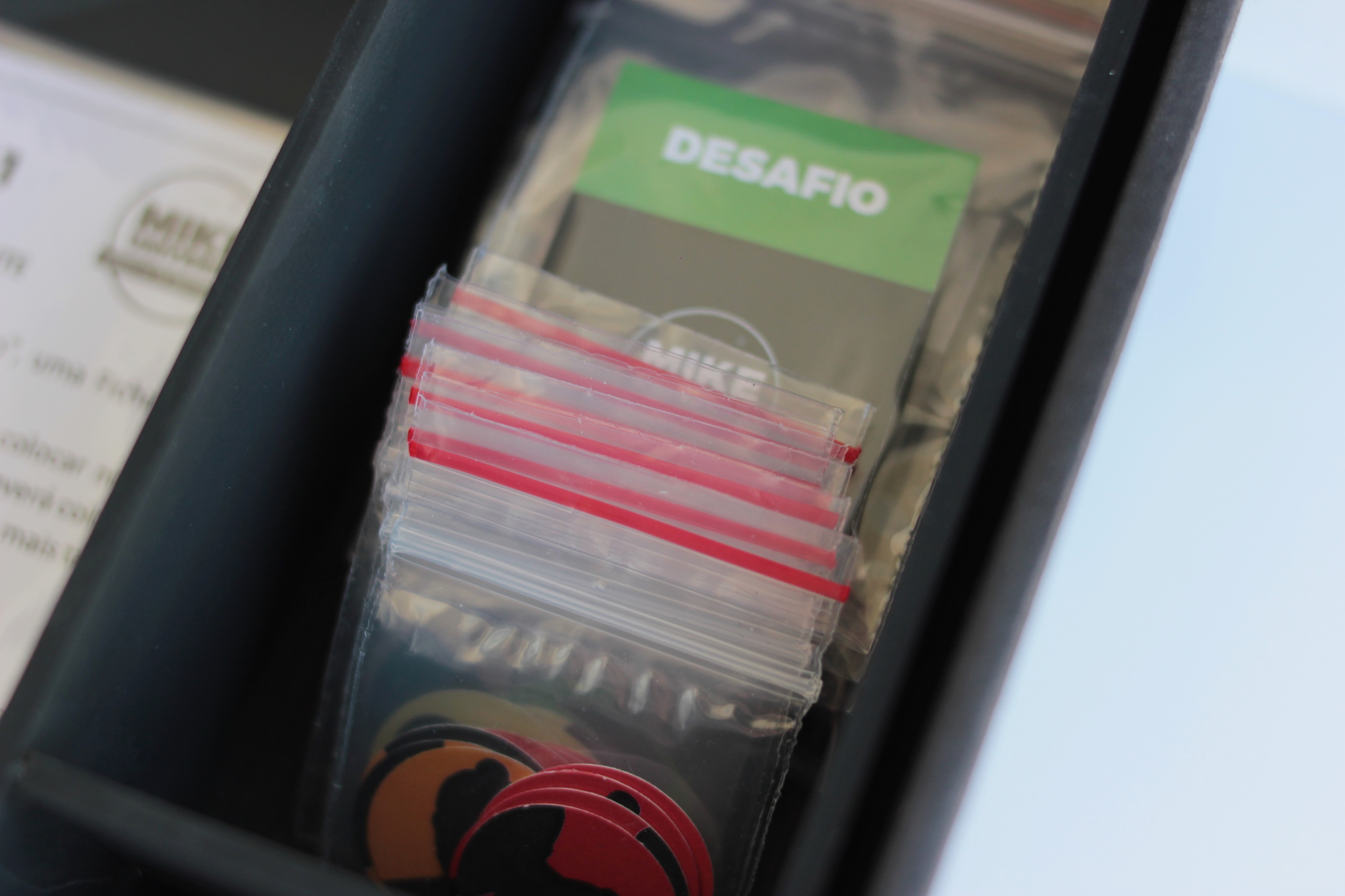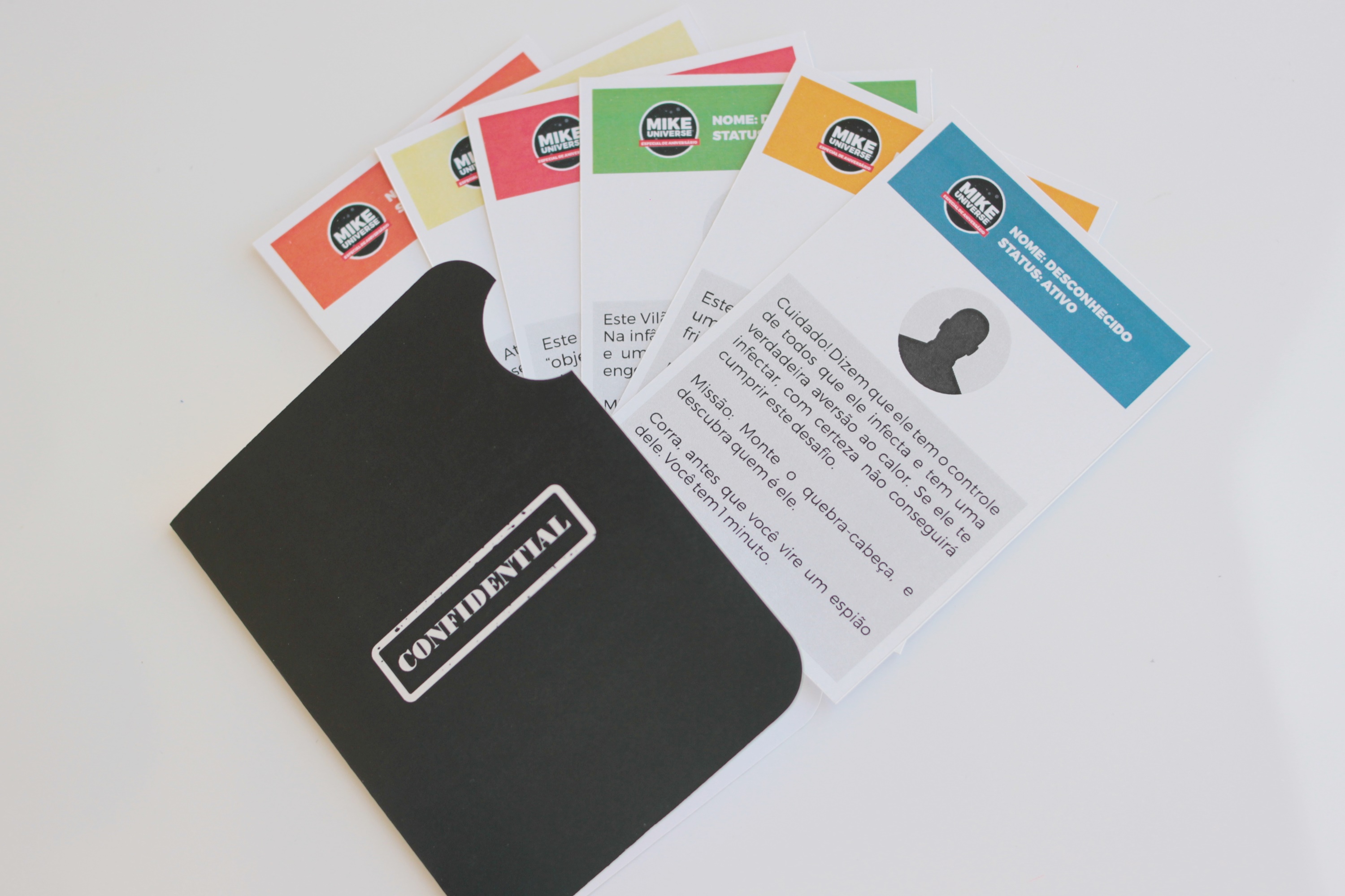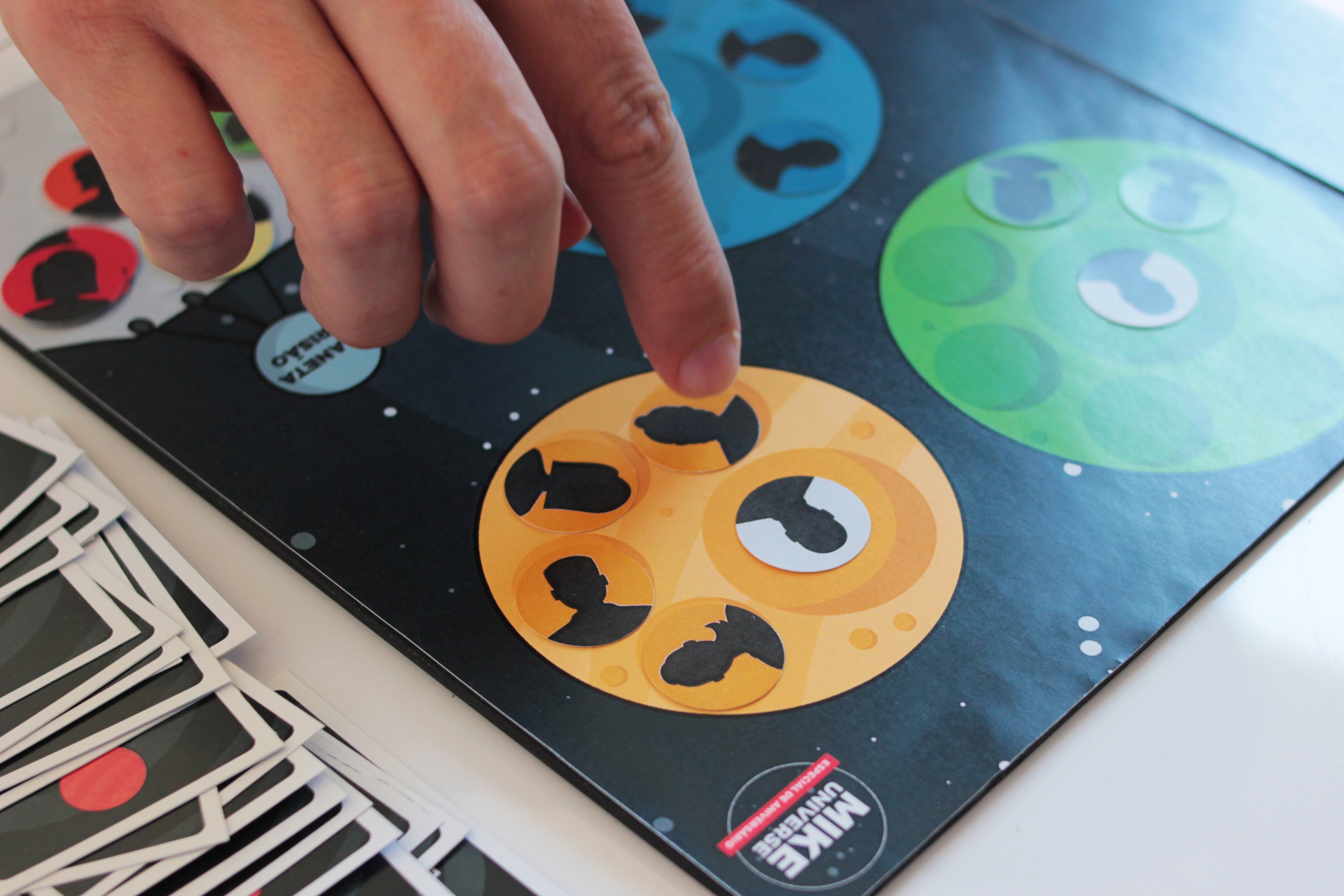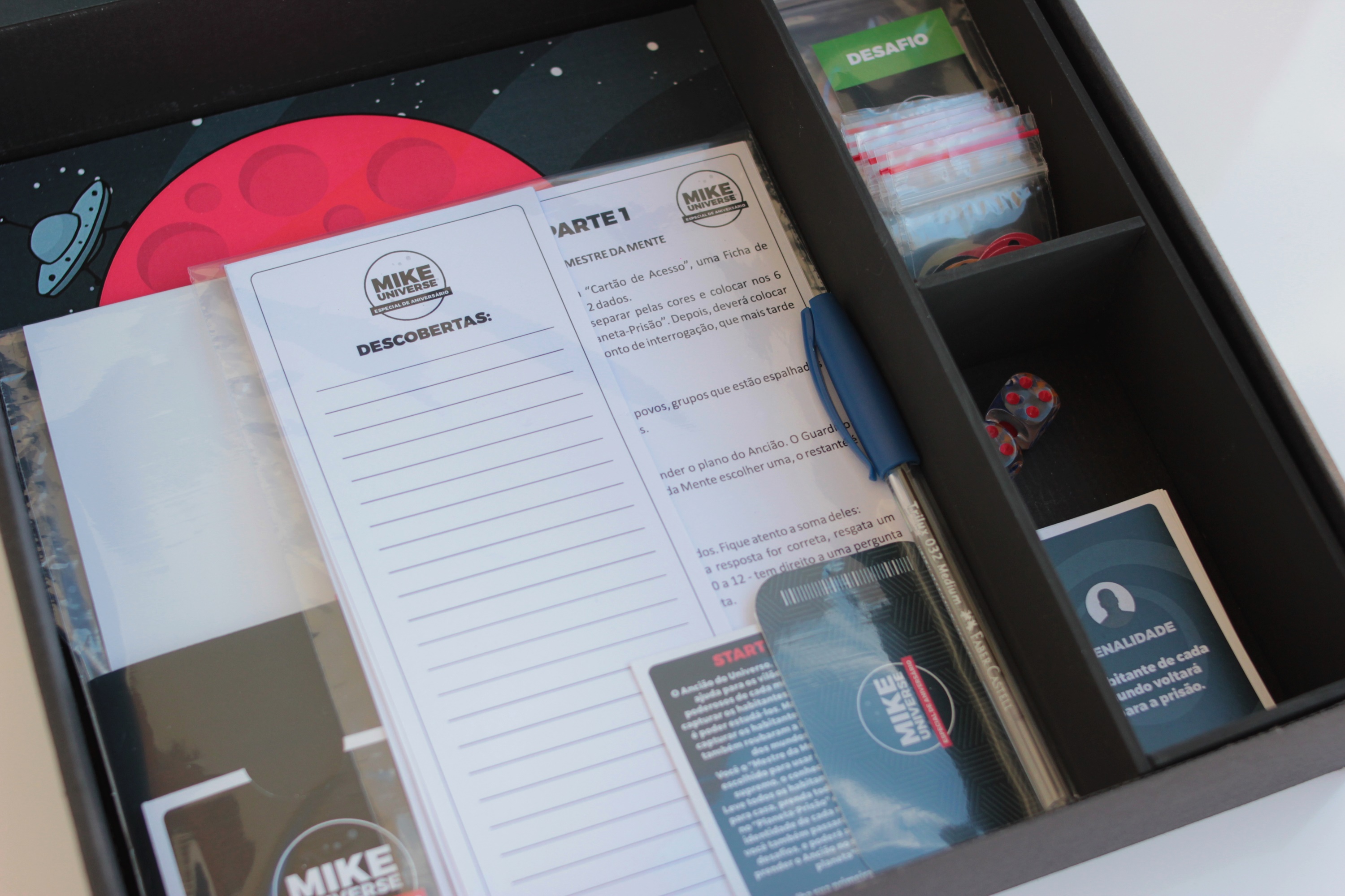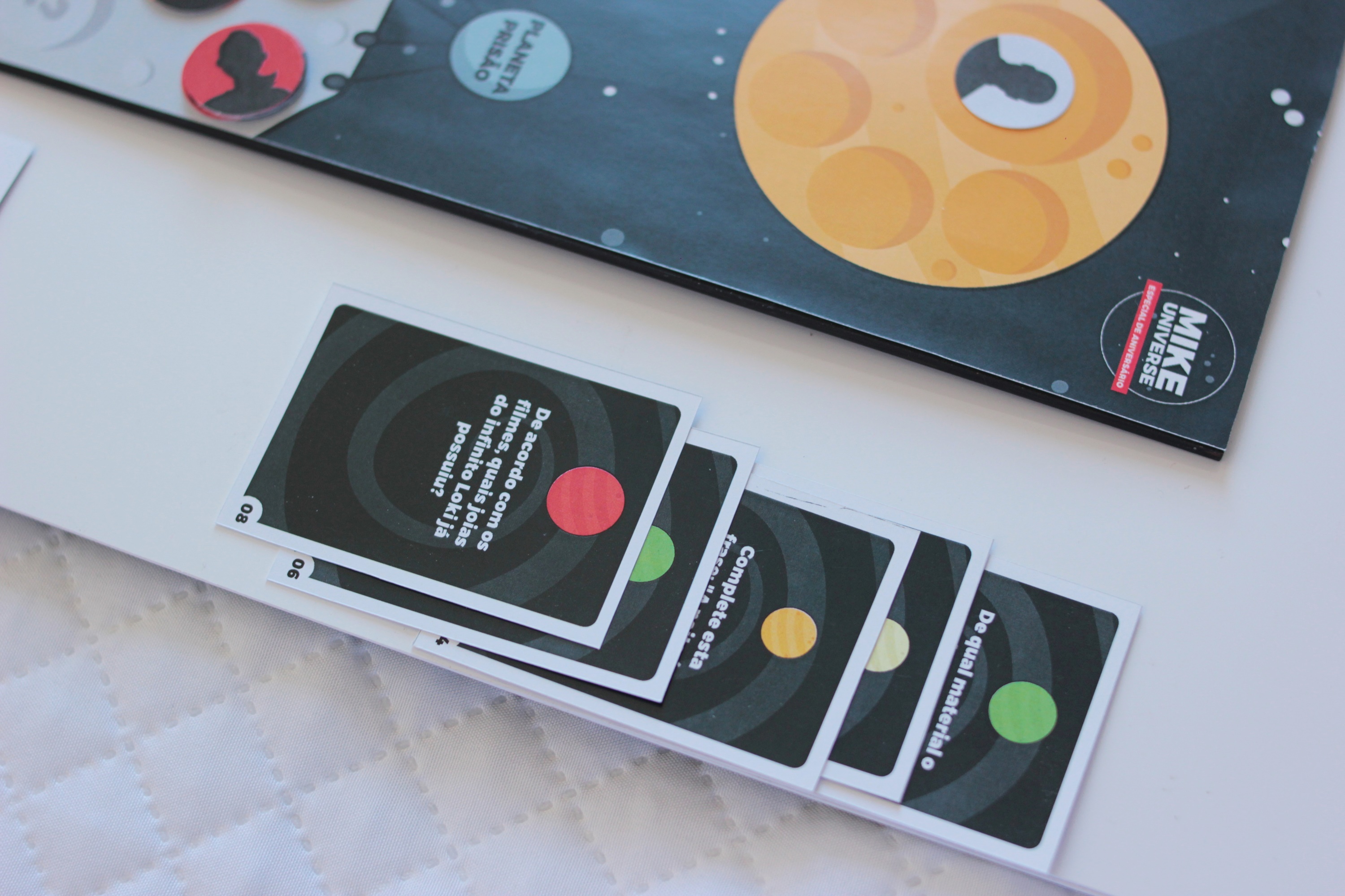 O objetivo era representar o Universo do Mike, unindo todos esses “mundos”. Ao passar dos dias o jogo evoluía, a quantidade de peças aumentava e os desafios também. Com tudo pronto, fiz a impressão do jogo, da capa da caixa, comprei MDF sob medida para a base do tabuleiro e para o organizador dentro da caixa, e foi hora de montar todo o jogo e separar as peças.