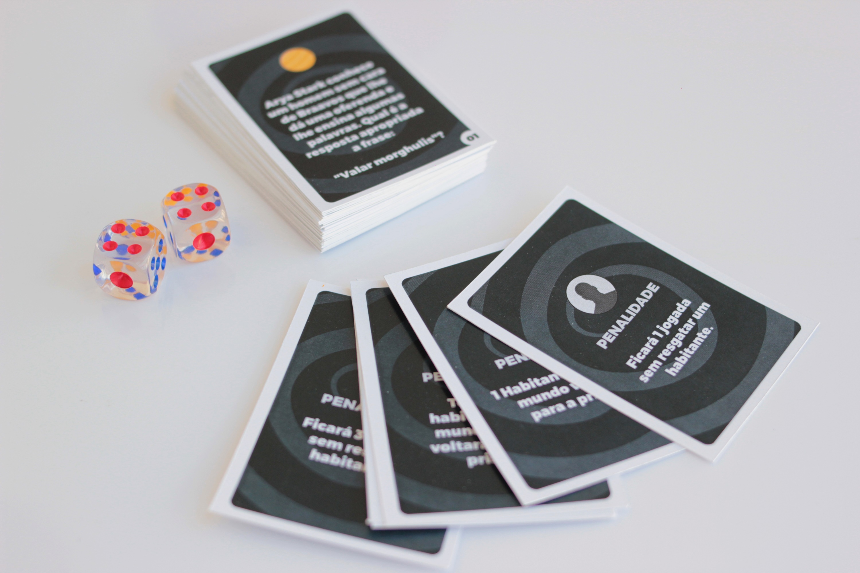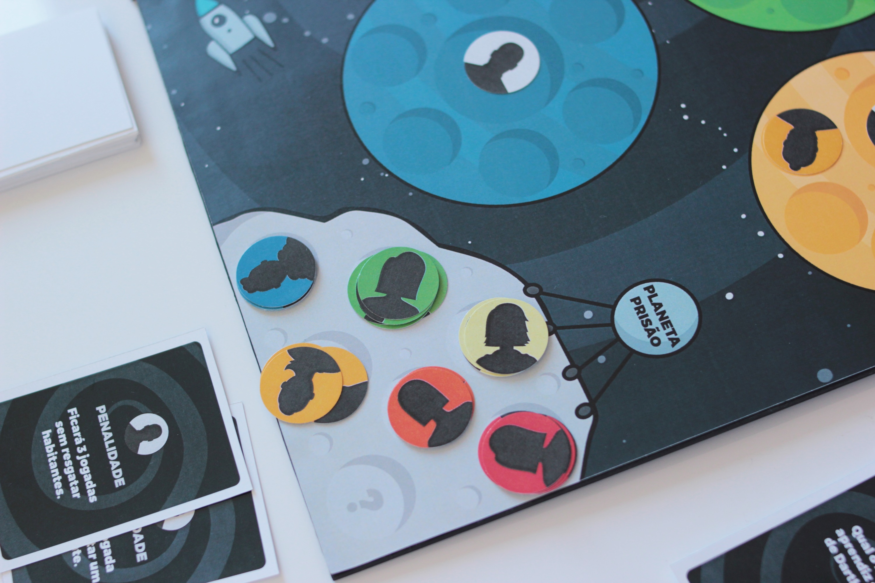 Fiz centenas de pesquisas de jogos, e decidi que no tabuleiro teria o desenho de um universo, com 6 mundos e 1 “Planeta-Prisão”. Para essa criação me inspirei em diversos jogos: War, Uno, Forca, Jogo da Memória, Jogo de perguntas, Detetive, Quebra-cabeça e Jogos de expansão.