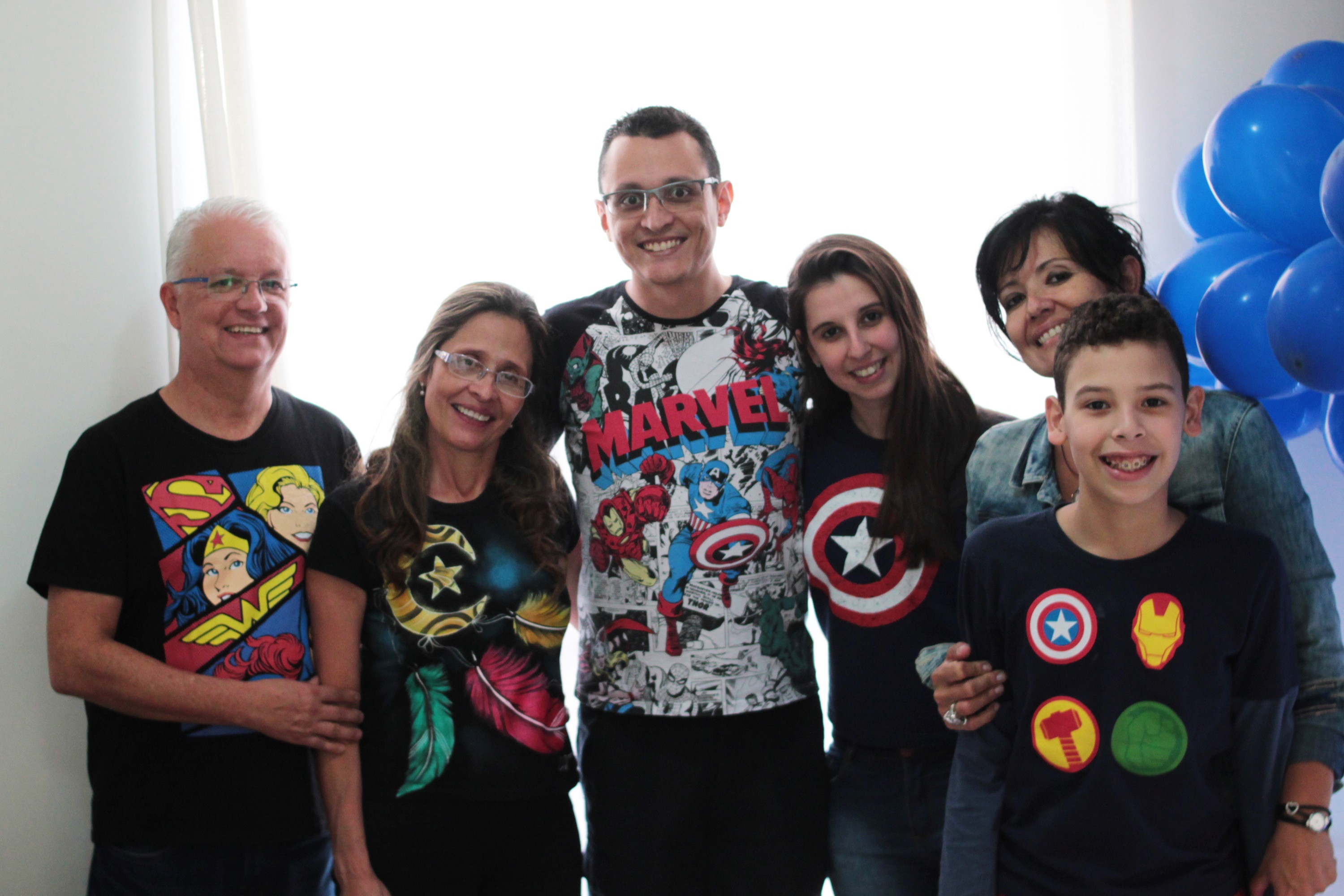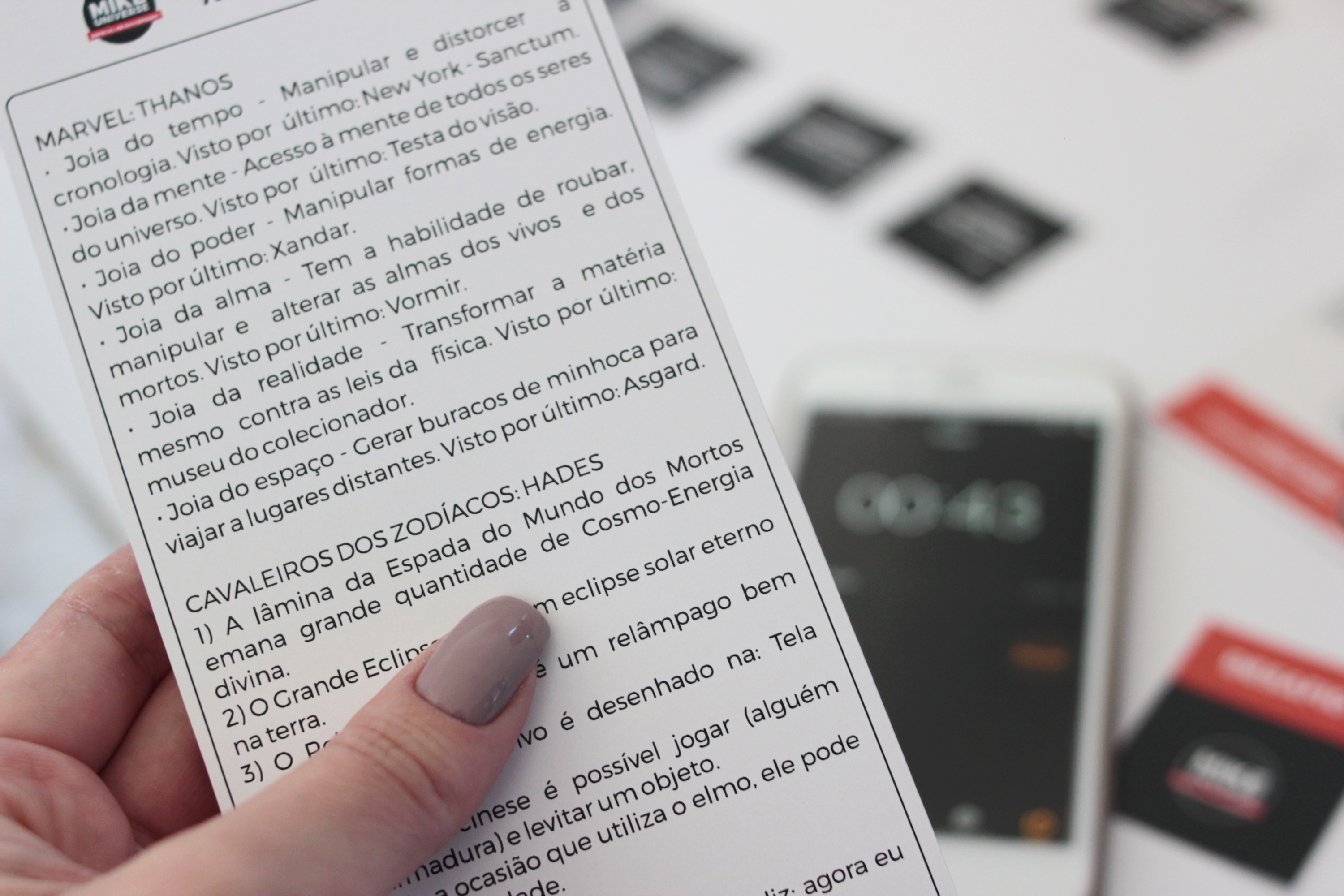 Enfim, ele respondeu todas as charadas e pôde então receber suas recompensas. Entre as charadas dos presentes, uma delas tinha referência ao filme: Vingadores Guerra Infinita, já que a HQ era do Thanos, representei o que ele fez com os heróis favoritos do Mike, entregando uma caixinha cheia de “pó (gliter)” 😀